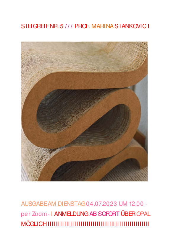 Stegreif 5 - Prof. Marina Stankovic Ausgabe am Dienstag, den 04.07.2023 um 12 Uhr Anmeldung über OPAL ab sofort möglich. Beginn Di., 04. Juli 2023 / 12.00 Uhr - Ende Fr., 07. Juli 2023 / 17.00 Uhr Vortragender / Veranstalter Prof. Marina Stankovic Zur Anmeldung über OPAL >Abgabedatum wird noch bekanntgegeben.