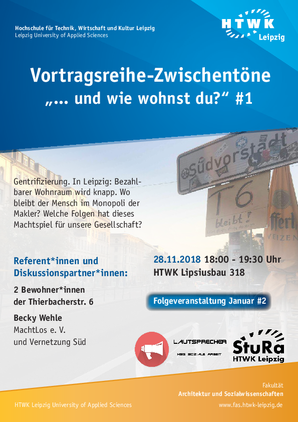 Im 7. Vortrag im Rahmen der außercurricularen Veranstaltungsreihe ZWISCHENTÖNE kommen Referent*innen und Bewohner*innen zum Thema Gentrifizierung (Bezahlbarer Wohnraum in Leipzig?) zu Wort.